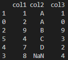 'col2' : ['A','A','B',np.nan, 'D','C'],