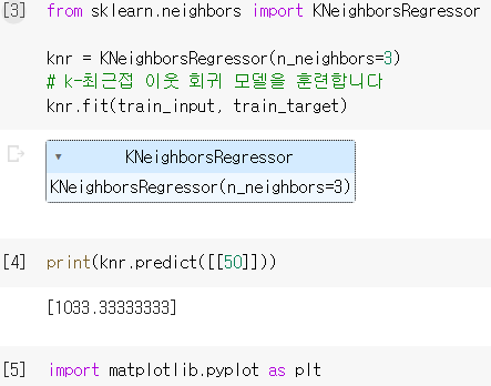 이때, 모델을 KNeighborsRegressor를 사용하고, n_neighbors 인자로 k의 값을 지정했습니다.