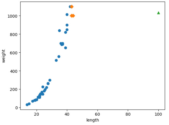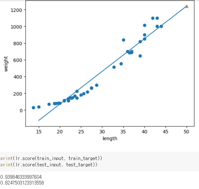 여기까지 데이터 준비하고, 예상해보면 길이가 50cm인 농어는 1033g으로 예측됩니다.