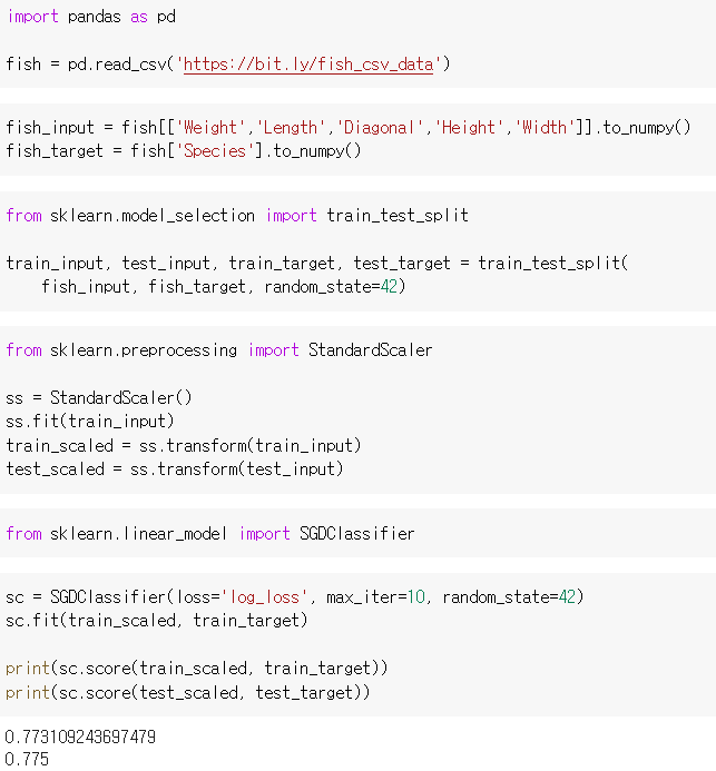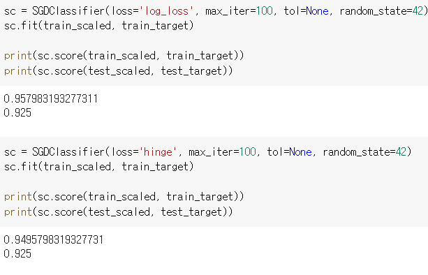 데이터 전처리를 진행하고 SGDClassifier객체를 생성하되, loss='log_loss', 10epoch만큼 진행합니다.