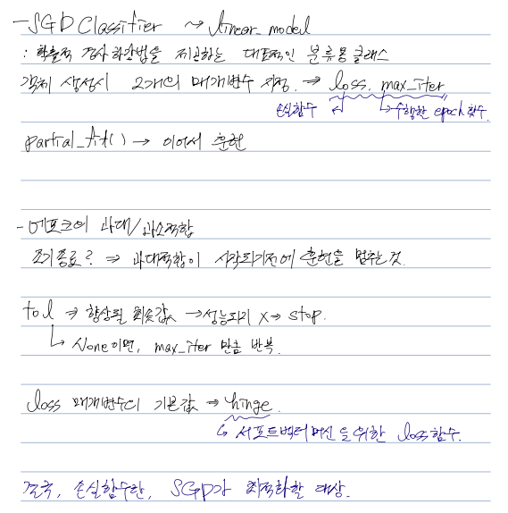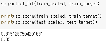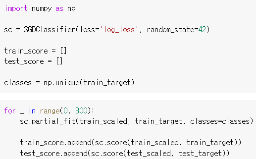 partial_fit()은 1 epoch씩 이어서 훈련할 수 있습니다.