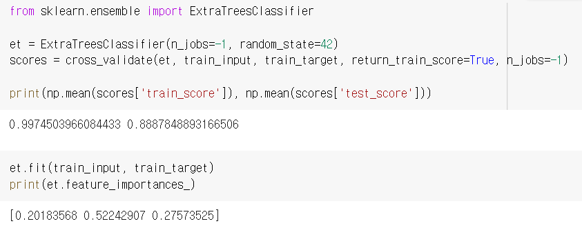 : 랜덤 포레스트와 비슷하게 100개의 결정 트리를 훈련하고, 대부분 매개변수를 지원하지만, 부트스트랩 샘플이 아니라 전체 훈련 세트를 사용한다.