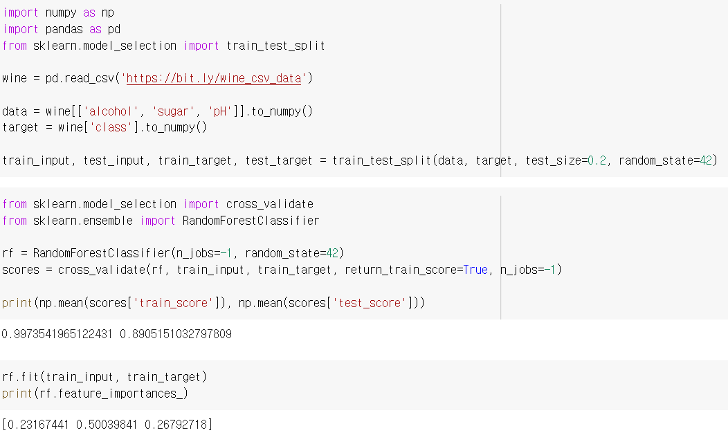 -> 랜덤 포레스트가 특성의 일부를 랜덤하게 선택하여 결정 트리를 훈련하기 때문입니다.